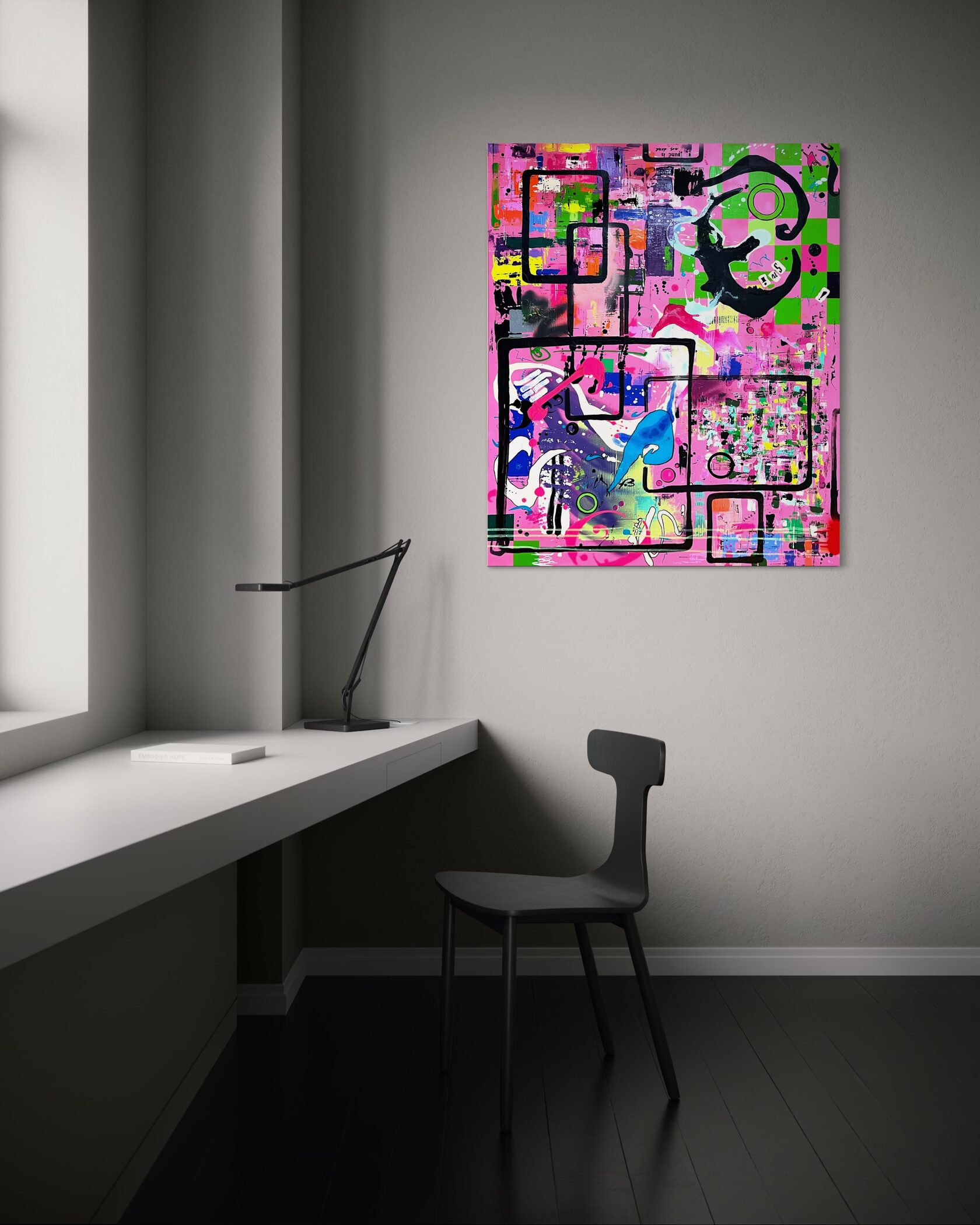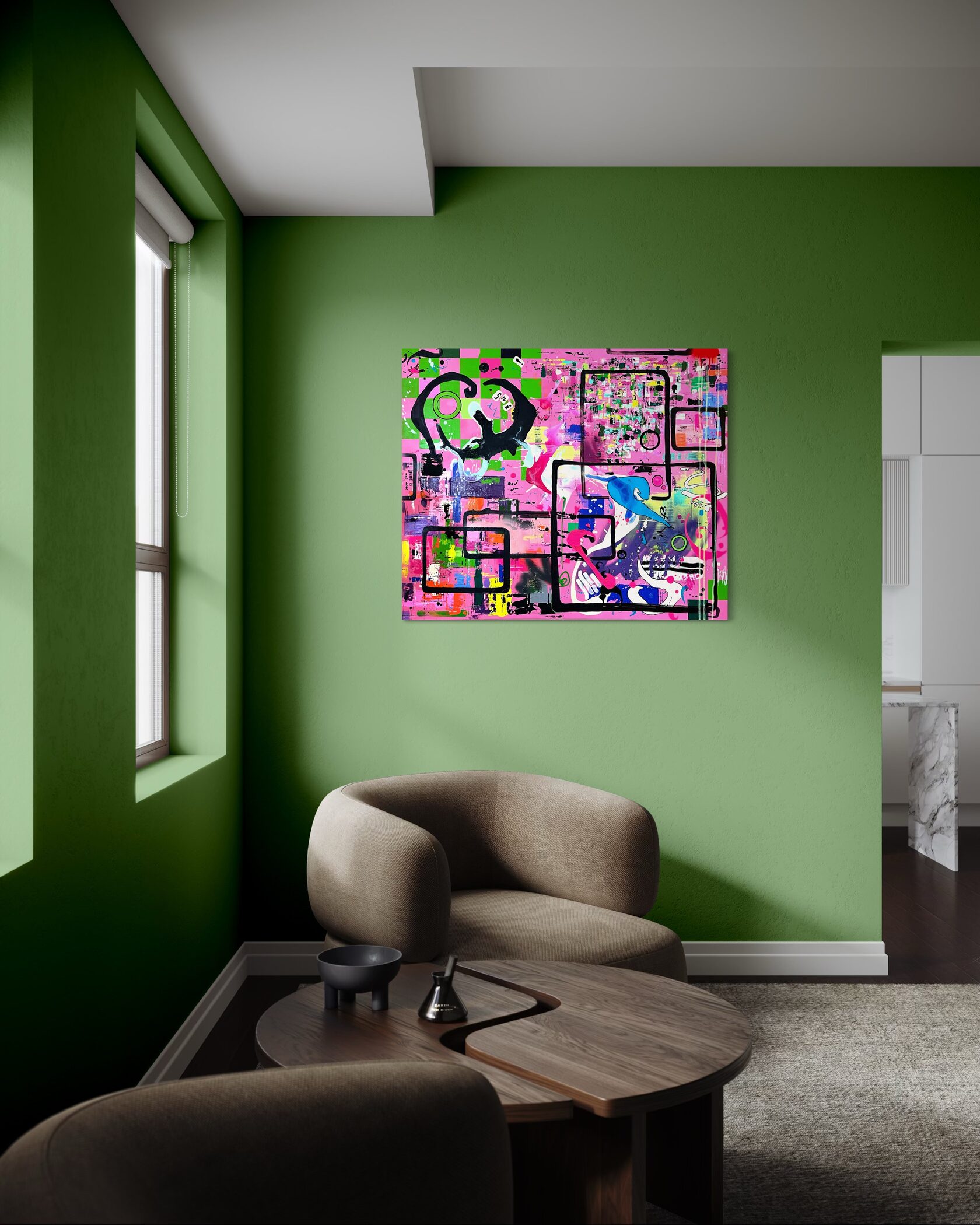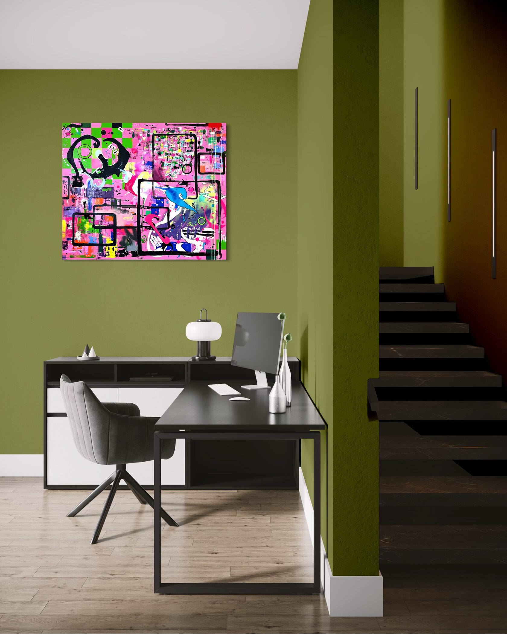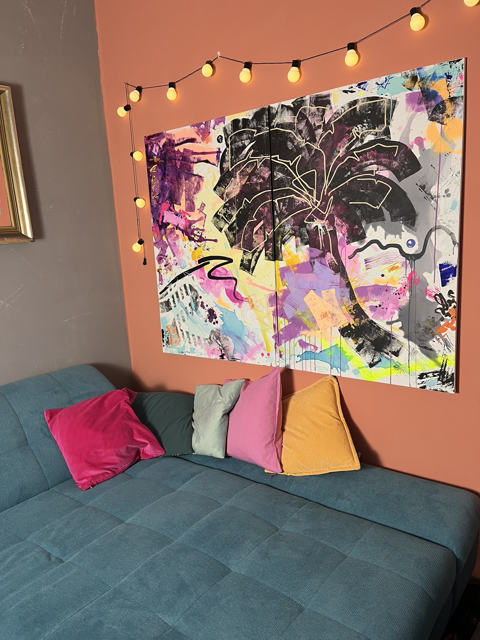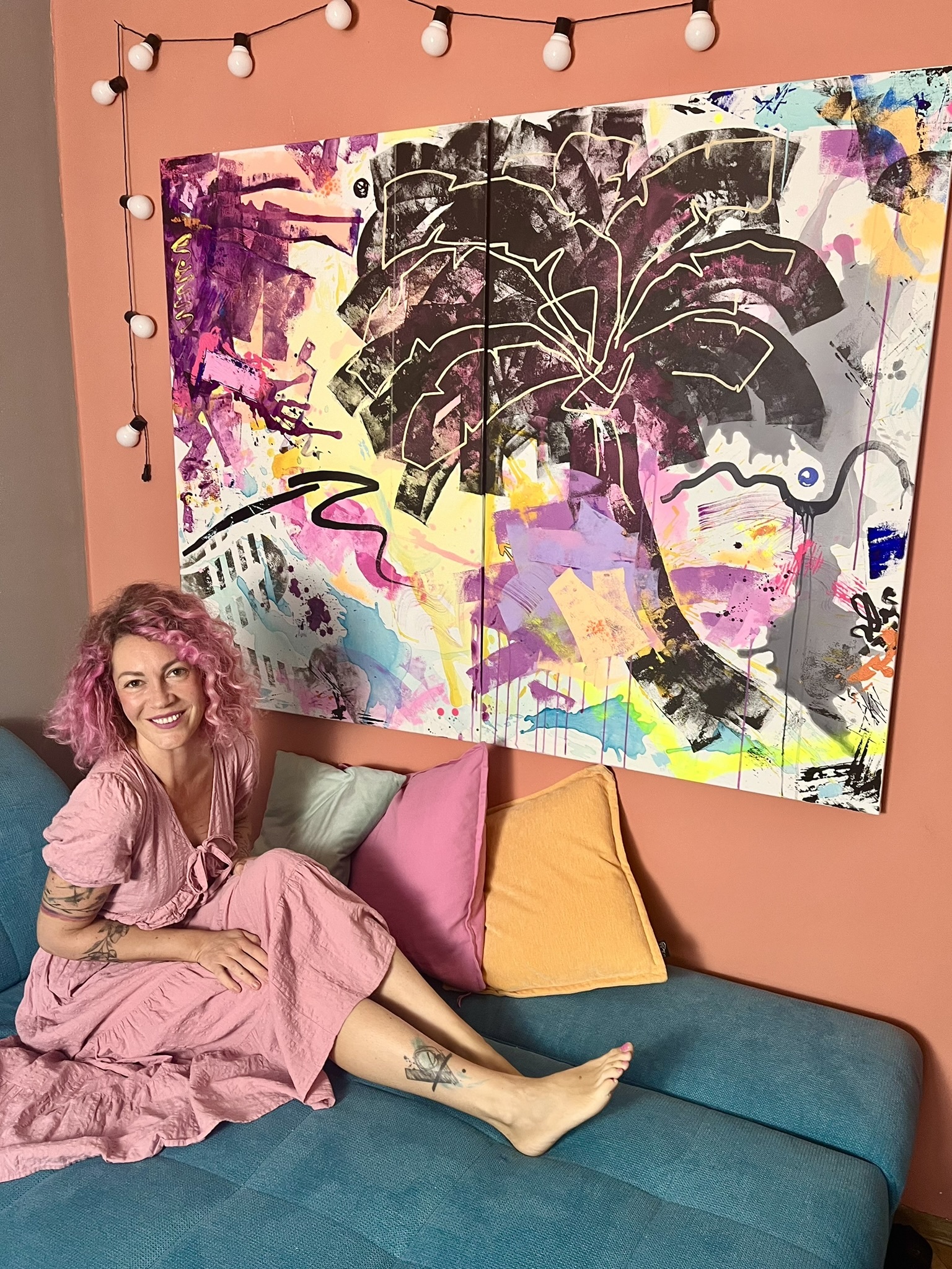 Zelený podklad jako základ, růžová jako lahodně kontrastní barva a další jejich odstíny doplněné o několik pastelově pestrých barviček mu dodávávají nádech rozvernosti, hravosti a jiskřivosti. Uhlazené horizontálně vertikální tahy v pravém horním rohu dramaticky konverzují s nahodilými výbuchy barev uprostřed. Energie a výraz postavy spokojeně rozjímající nad vším, co jí dělá radost, nad vším, co se jí povedlo, nad vším, na co je pyšná, nad láskou k životu, tvoří dílo, ve kterém můžete uvidět všecky svoje vnitřní touhy a naděje. ♥️ A to je obraz Pride!