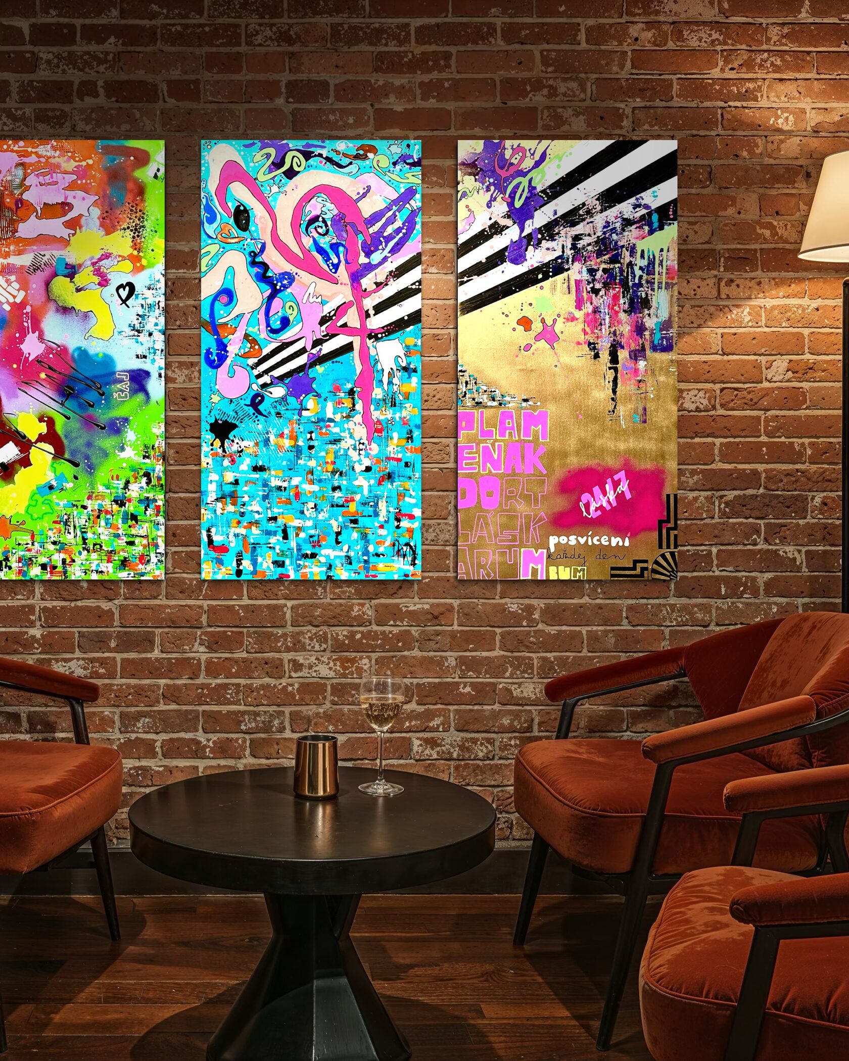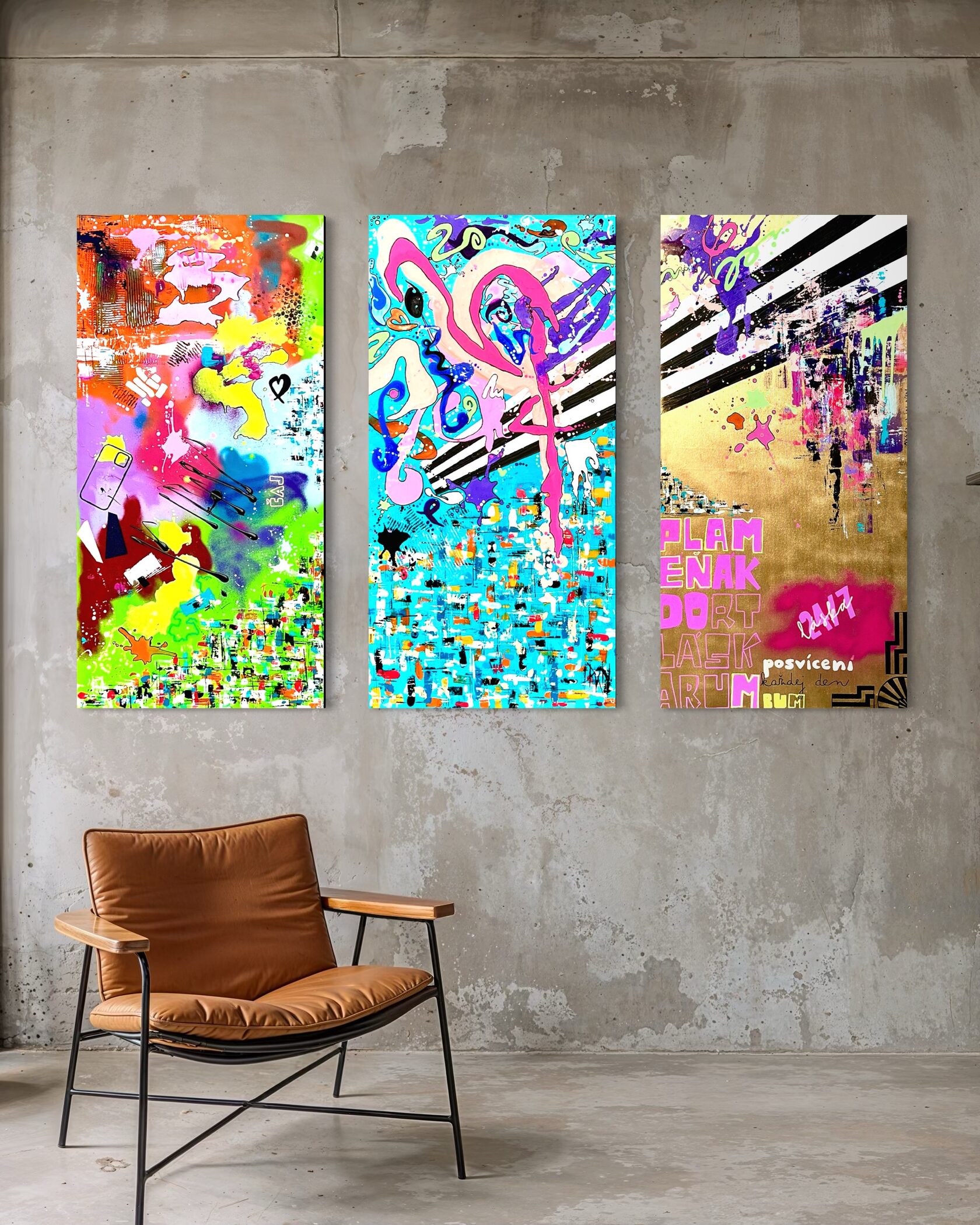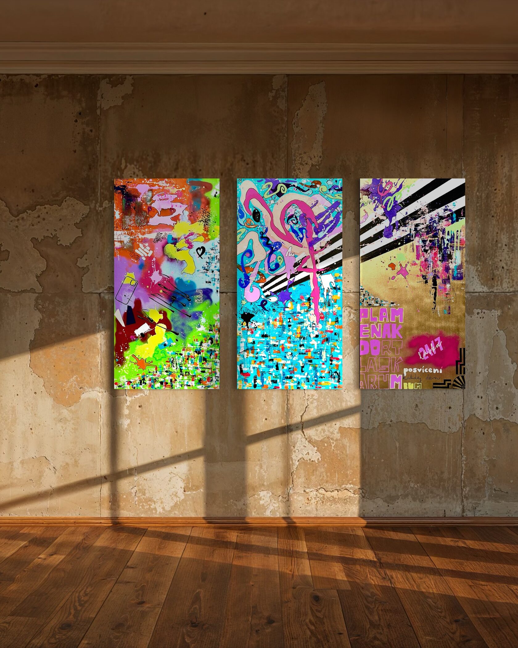 Trojdílo teď potkáte na výstavě v galerii NSPU, Husinecká 8. Anebo s dalšími obrazy na prodej na webu.