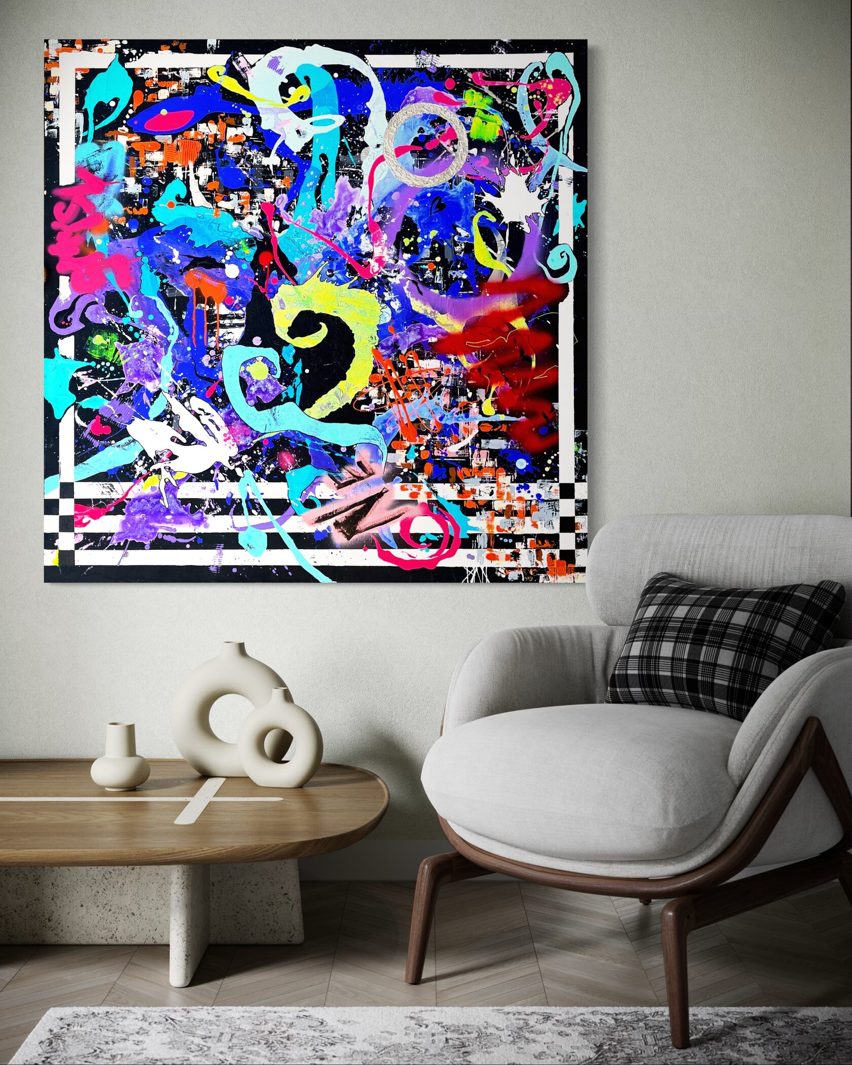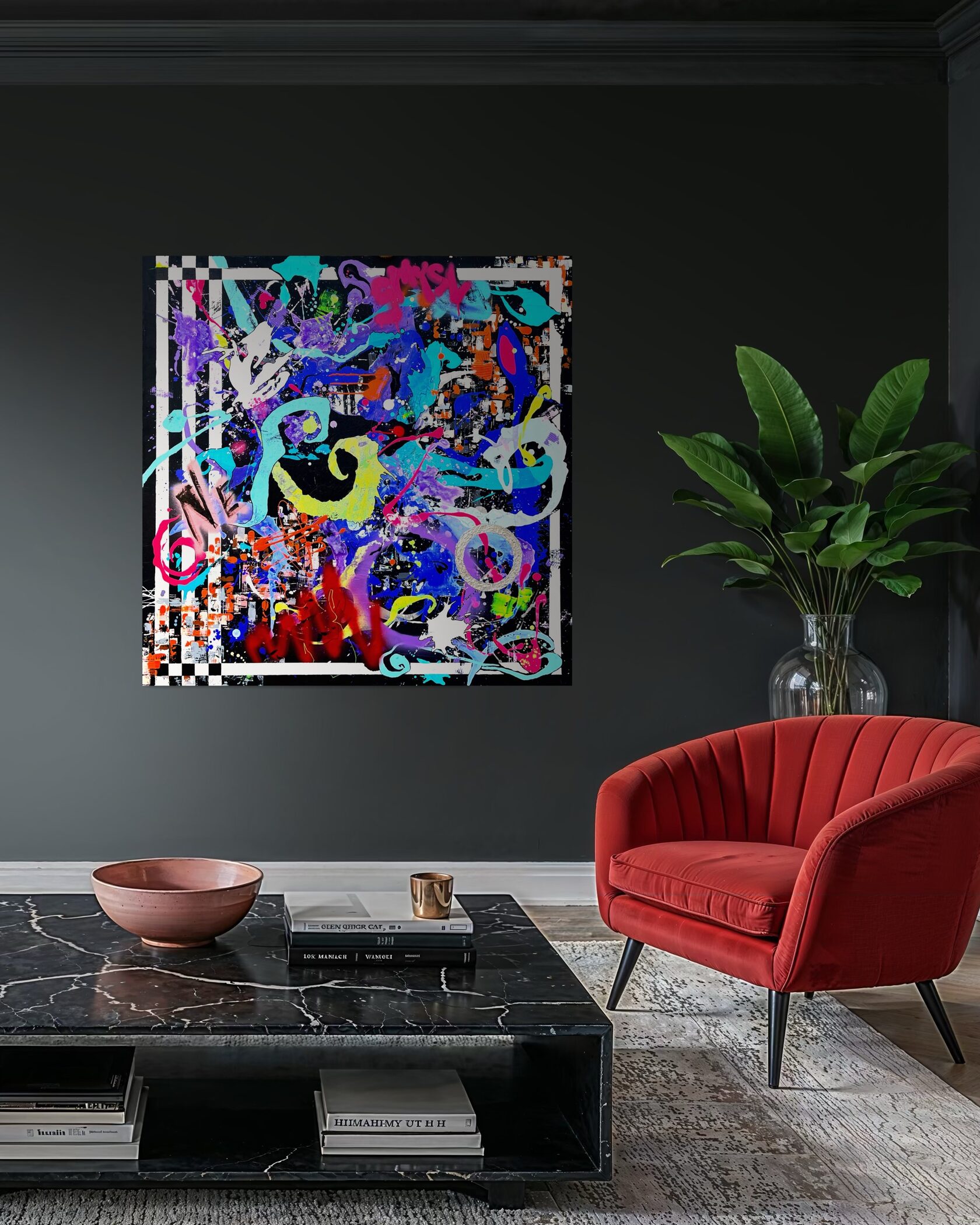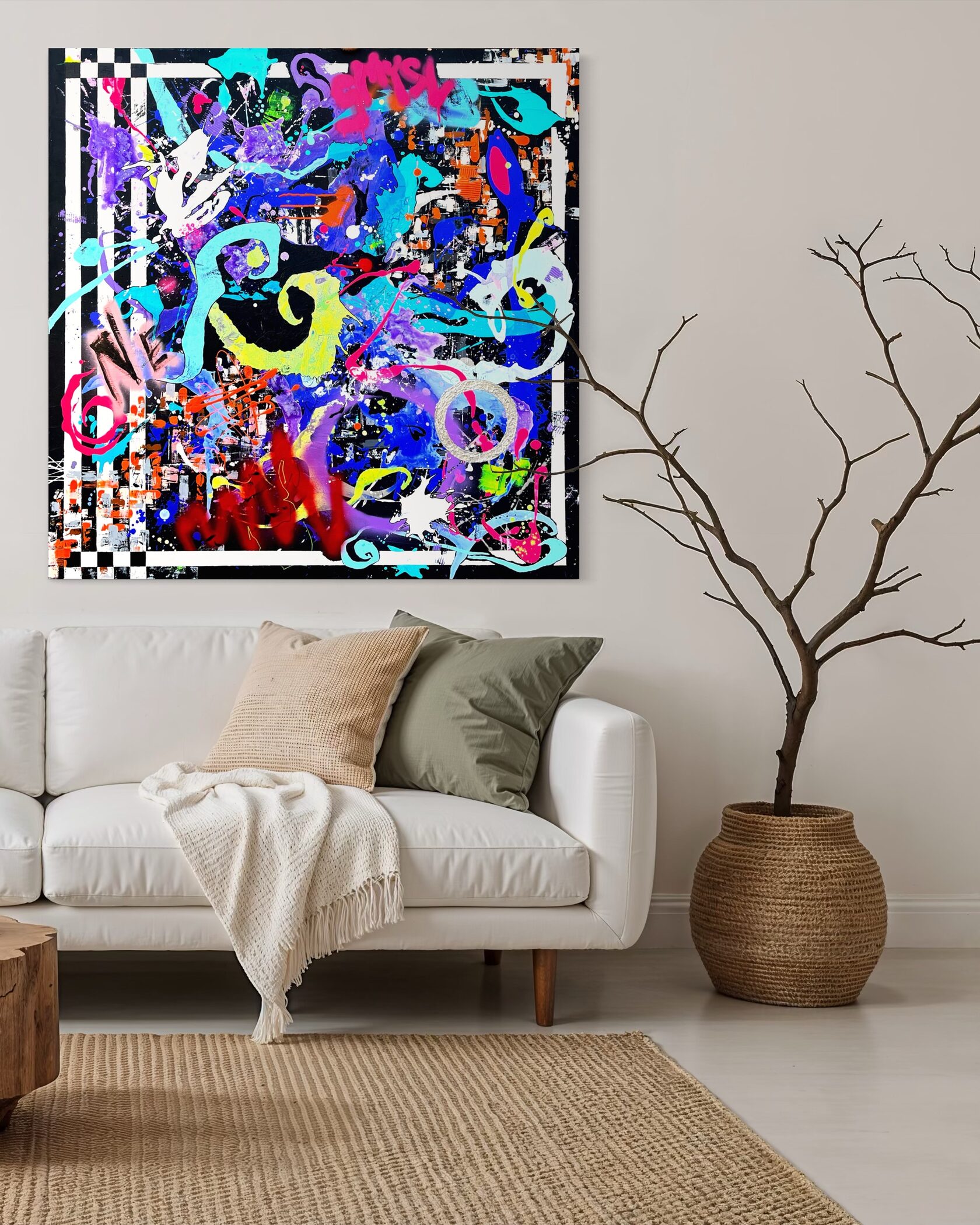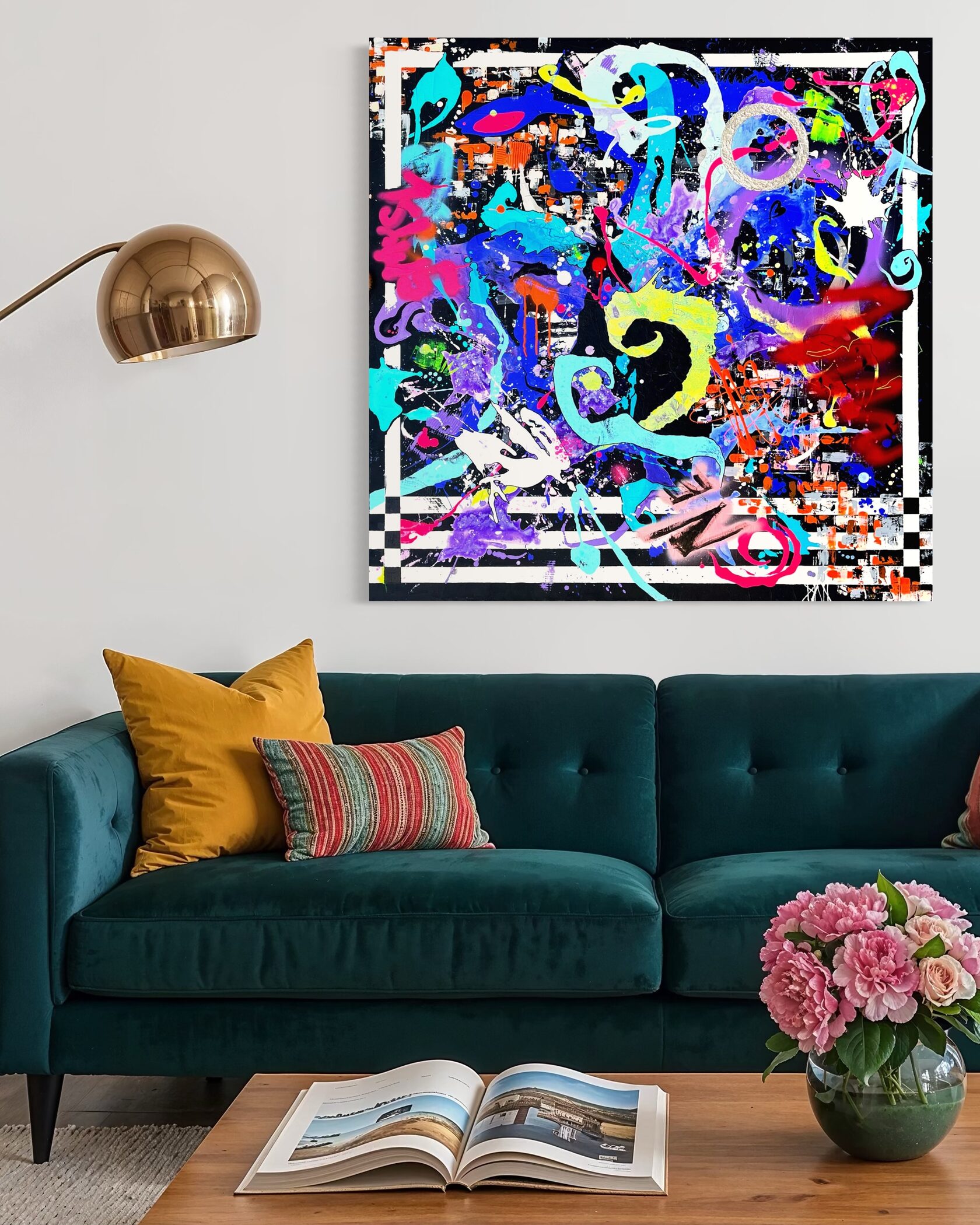 To se stalo i u tohohle velikána (130x130 cm), který měl původně být hodně decentní, ba dokonce uhlazený. Plátno si ale řeklo „decentní my ass“ a bylo. Teda nebylo. Chtěla jsem na něj nalít pár modrých a fialových šplíchů, ale ony se tak nějak úplně všechny slily… a tak se začala psát úplně nová story. Dokonce úplně nový žánr. Ano, bylo to drama, co vám budu, ale ten konec mě posadil na zadek…