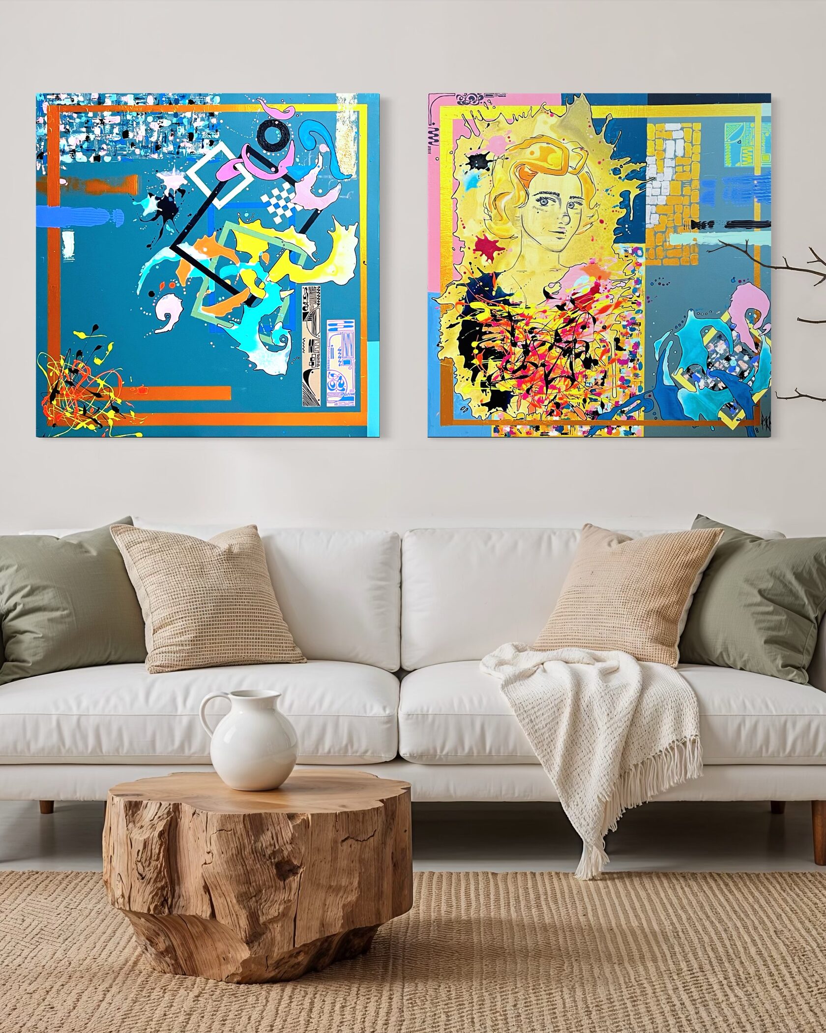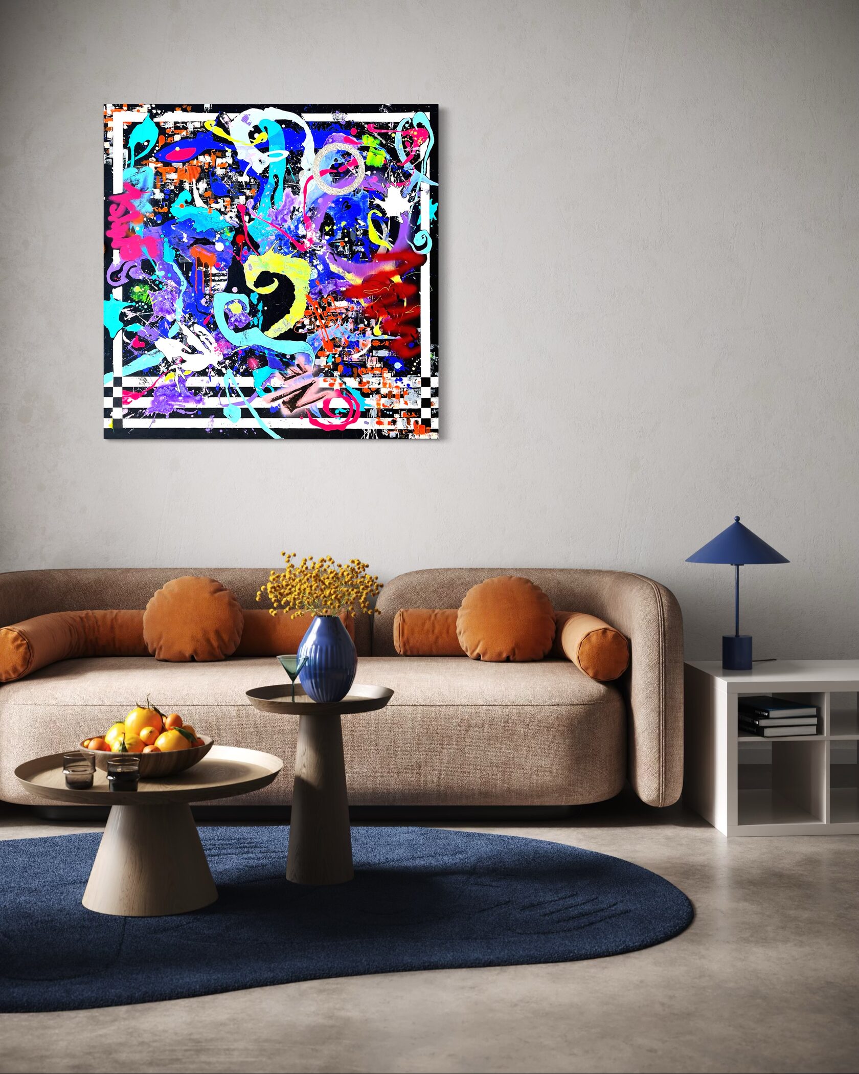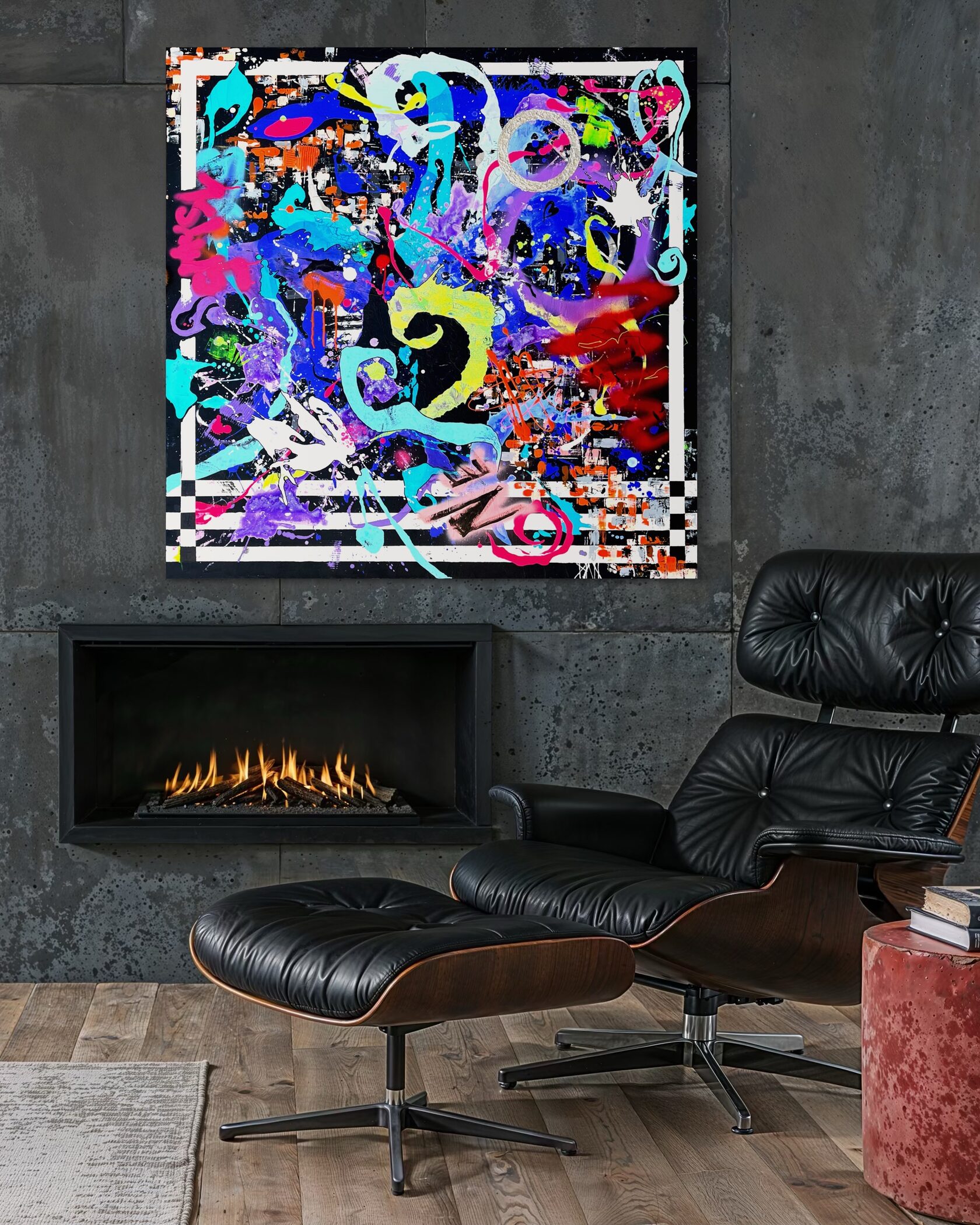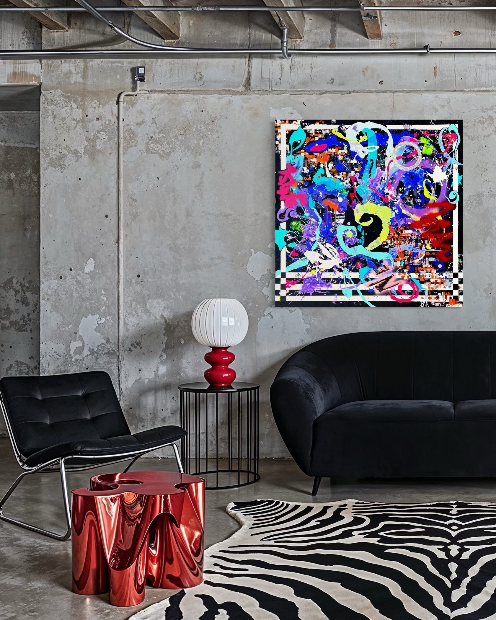 To se stalo i u tohohle velikána (130x130 cm), který měl původně být hodně decentní, ba dokonce uhlazený. Plátno si ale řeklo „decentní my ass“ a bylo. Teda nebylo. Chtěla jsem na něj nalít pár modrých a fialových šplíchů, ale ony se tak nějak úplně všechny slily… a tak se začala psát úplně nová story. Dokonce úplně nový žánr. Ano, bylo to drama, co vám budu, ale ten konec mě posadil na zadek…